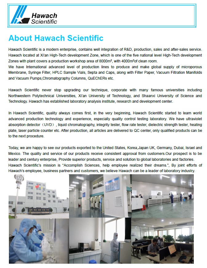 Каталог представляет продукцию компании Hawach Scientific, специализирующейся на лабораторном оборудовании и расходных материалах, включая шприцевые фильтры, мембранные фильтры, пробирки, крышки, фильтровальную бумагу и вакуумные системы. В каталоге подробно описаны технические характеристики, области применения и преимущества каждого продукта, а также приведены таблицы с артикулами и упаковочными данными.