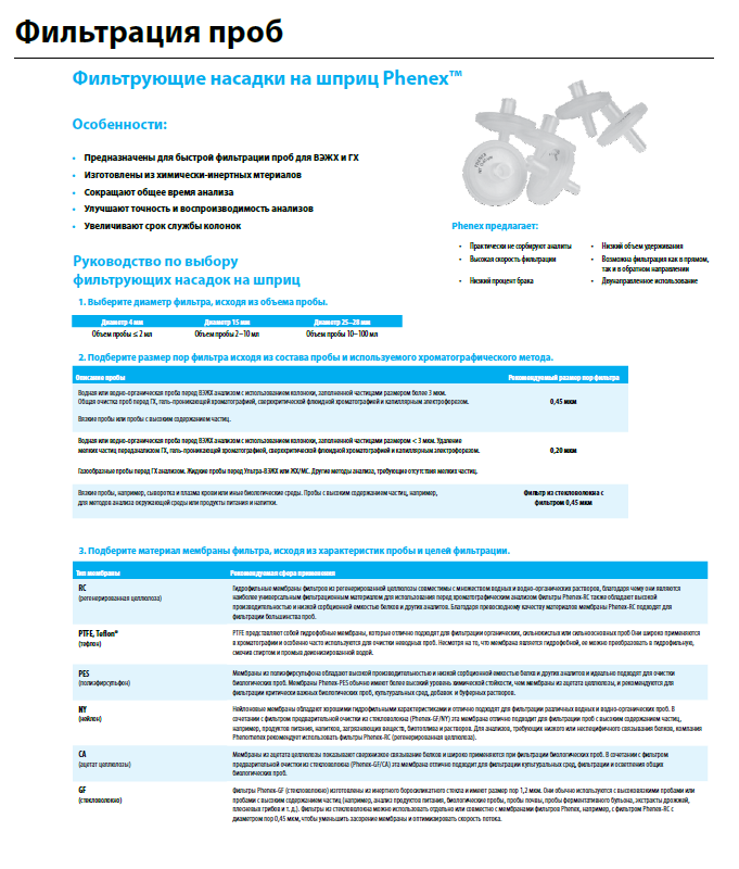 Этот каталог представляет продукцию компании Phenomenex, включая фильтрующие насадки на шприц для пробоподготовки в хроматографии, колонки для газовой и жидкостной хроматографии, а также аксессуары для защиты и увеличения срока службы колонок. В нем подробно описаны характеристики, области применения и руководства по выбору продуктов для различных методов анализа, таких как ВЭЖХ, ГХ и ТФЭ. Каталог также содержит информацию о новых технологиях, таких как гибридные частицы Kinetex, обеспечивающие высокую эффективность разделения.